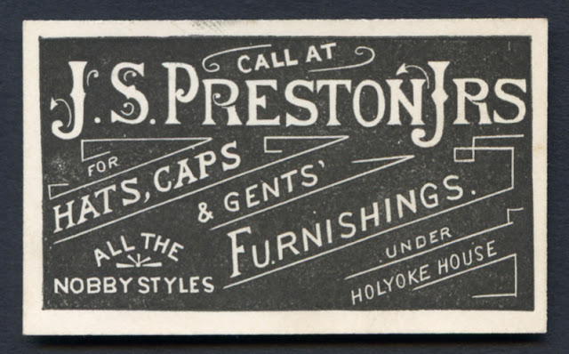 1880s advertising card for J.S. Preston Jrs., located at 15 Dwight Street in Holyoke, Massachusetts. From what I could gather, it appears they went out of business in 1890. I love the use of the word "Nobby" on the card.